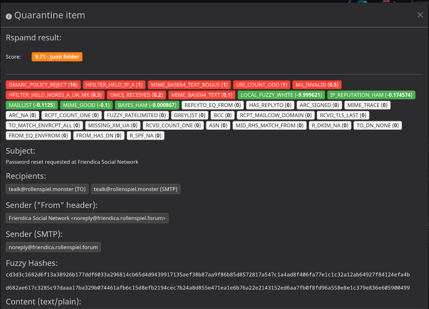 In the end, it lands in quarantine, another user hasn't received an email yet, probably because it was filtered out by the provider as it doesn't seem to be filled out properly.